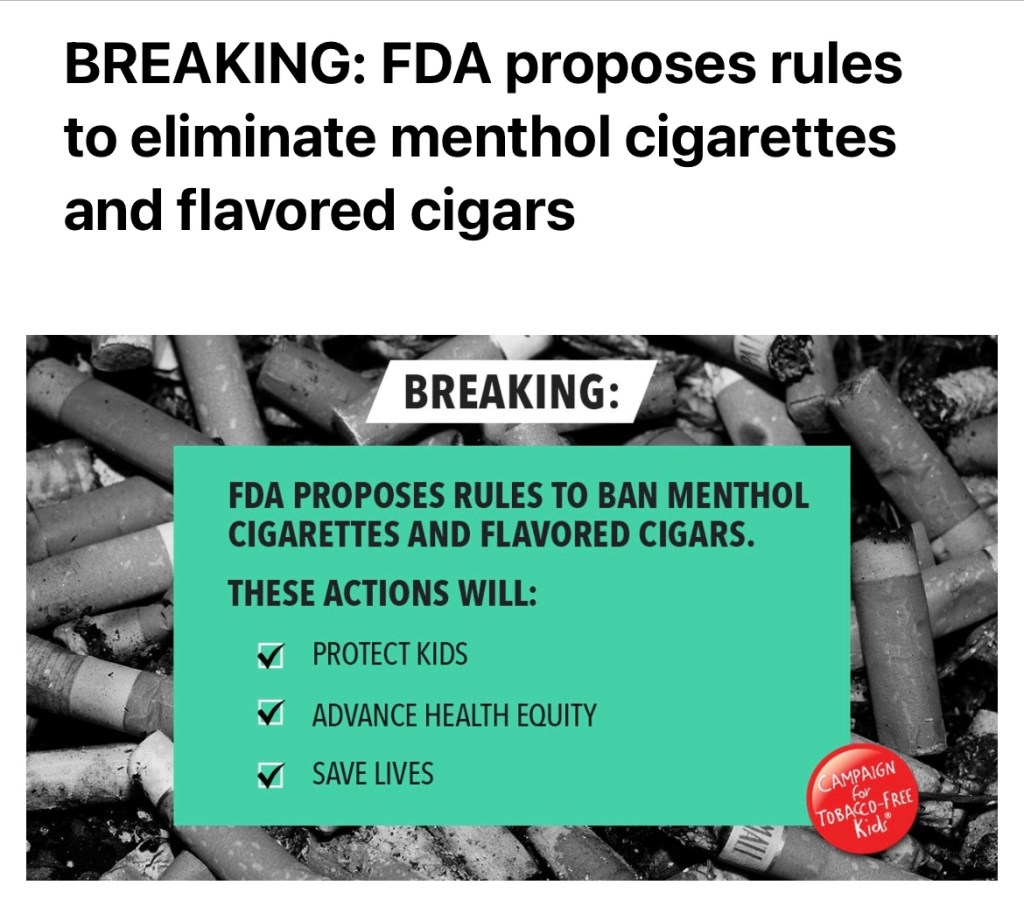 April 28, 2022 Learn more here https://www.tobaccofreekids.org/press-releases/2022_04_28_fda-menthol-announcement?eType=EmailBlastContent&eId=c5615098-841f-4863-ab0e-673916279b9f Share this: Click to share on X (Opens in new window) X Click to share on Facebook (Opens in new window) Facebook Like Loading... Related