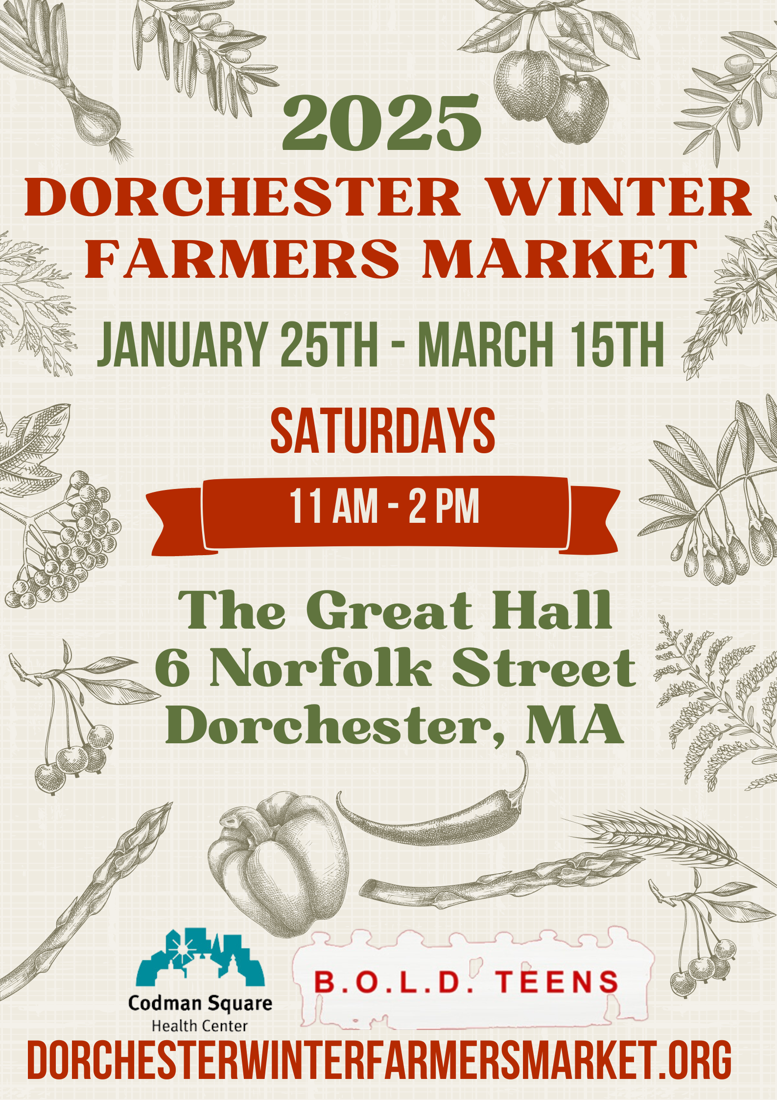 Dorchester Winter Farmers Market January 25, 2025 Share this: Click to share on X (Opens in new window) X Click to share on Facebook (Opens in new window) Facebook Like Loading... Related